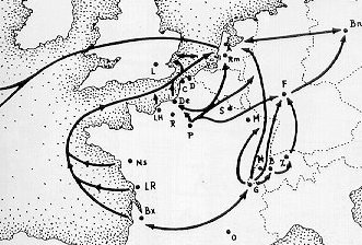 | The map below shows major routes taken by French Huguenots. |